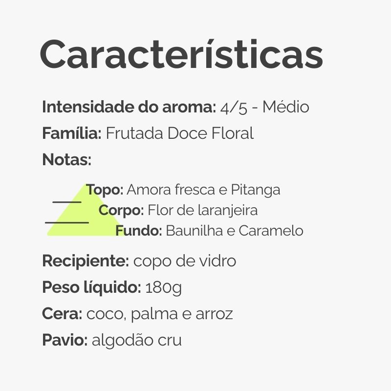 A doçura vibrante da amora se une ao frescor das frutas vermelhas e ao floral delicado, criando uma fragrância alegre, envolvente e feminina. No fundo, notas suaves de musk e baunilha trazem conforto e suavidade. Um aroma frutado e romântico — perfeito para perfumar o ambiente com charme, alegria e um toque delicado de doçura.